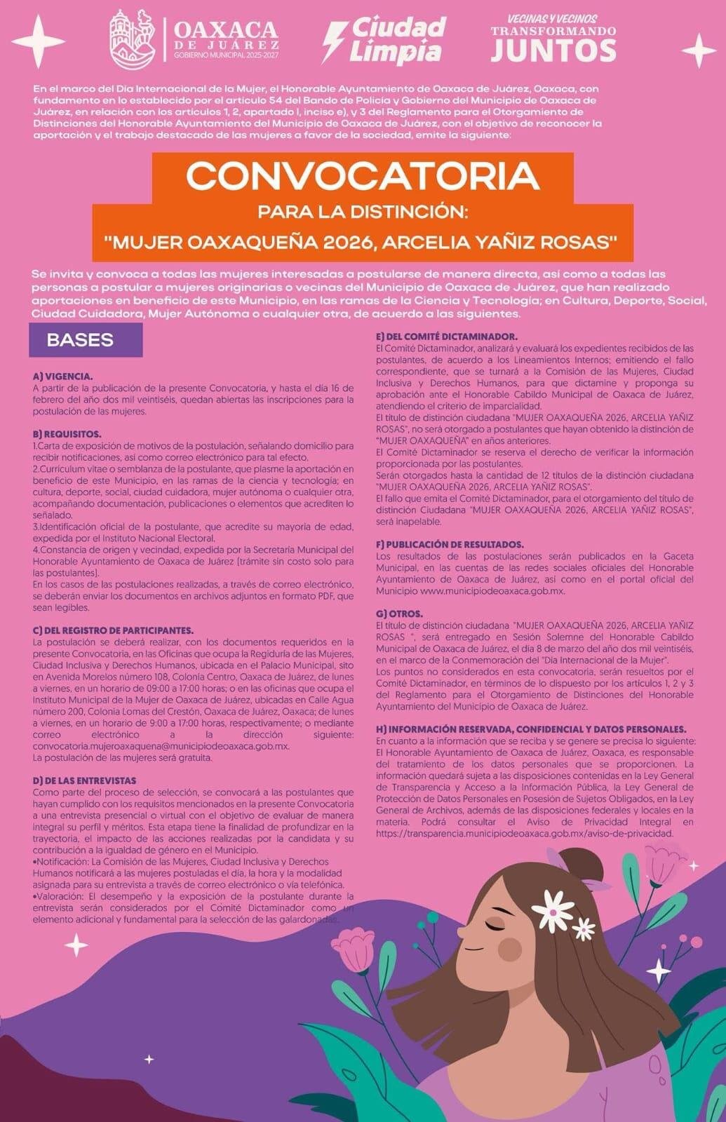 Oaxaca de Juárez, Oax. 10 de febrero de 2026.- En el marco de la conmemoración del Día Internacional de la Mujer, el Honorable Ayuntamiento de Oaxaca de Juárez emitió la convocatoria para la distinción ciudadana “Mujer Oaxaqueña 2026, Arcelia Yañiz Rosas”, con el objetivo de reconocer la trayectoria, el esfuerzo y las contribuciones relevantes de mujeres originarias o vecinas del municipio en beneficio de la sociedad.