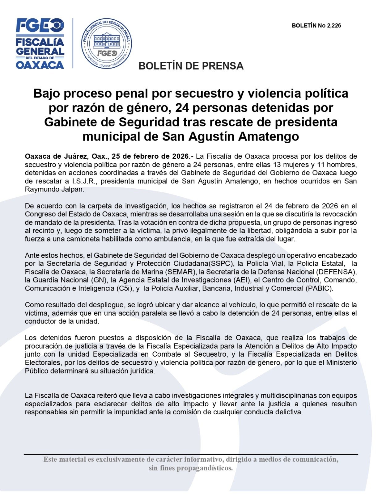 Oaxaca de Juárez, Oax., 25 de febrero de 2026.- La Fiscalía de Oaxaca procesa por los delitos de secuestro y violencia política por razón de género a 24 personas, entre ellas 13 mujeres y 11 hombres, detenidas en acciones coordinadas a través del Gabinete de Seguridad del Gobierno de Oaxaca luego de rescatar a I.S.J.R., presidenta municipal de San Agustín Amatengo, en hechos ocurridos en San Raymundo Jalpan.