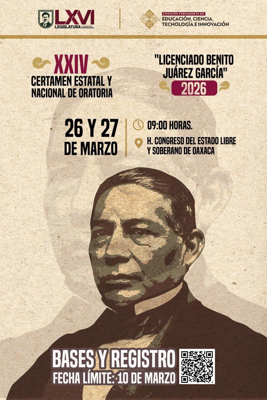 *San Raymundo Jalpan, Oaxaca, a 15 de enero de 2026.-* La LXVI Legislatura del Congreso del Estado de Oaxaca aprobó con 30 votos a favor un Punto de Acuerdo de Urgente y Obvia Resolución para la emisión de la convocatoria del XXIV Certamen Estatal y Nacional de Oratoria “Licenciado Benito Juárez García, 2026”, cuyo objetivo es enaltecer la memoria del Benemérito de las Américas y fortalecer la oratoria como una herramienta esencial para la vida pública, la formación de conciencia y el ejercicio democrático.