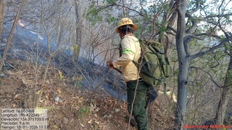 Región Istmo, Oax. 19 de enero de 2026.- A través del Centro Estatal de Manejo del Fuego (CEMF), las comisiones Estatal Forestal (Coesfo) y Nacional Forestal (Conafor) continúan con la atención de dos incendios forestales registrados en Santo Domingo Tehuantepec y Santiago Astata, en la región Istmo.