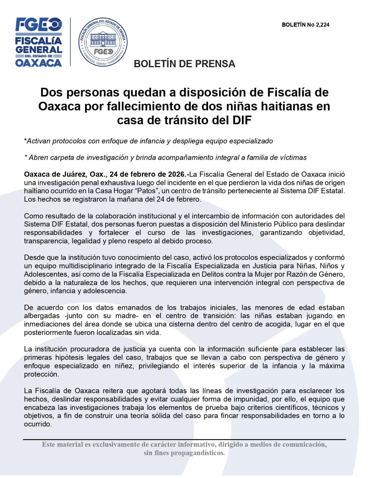 Oaxaca de Juárez, Oax., 24 de febrero de 2026.-La Fiscalía General del Estado de Oaxaca inició una investigación penal exhaustiva luego del incidente en el que perdieron la vida dos niñas de origen haitiano ocurrido en la Casa Hogar “Patos”, un centro de tránsito perteneciente al Sistema DIF Estatal. Los hechos se registraron la mañana del 24 de febrero.