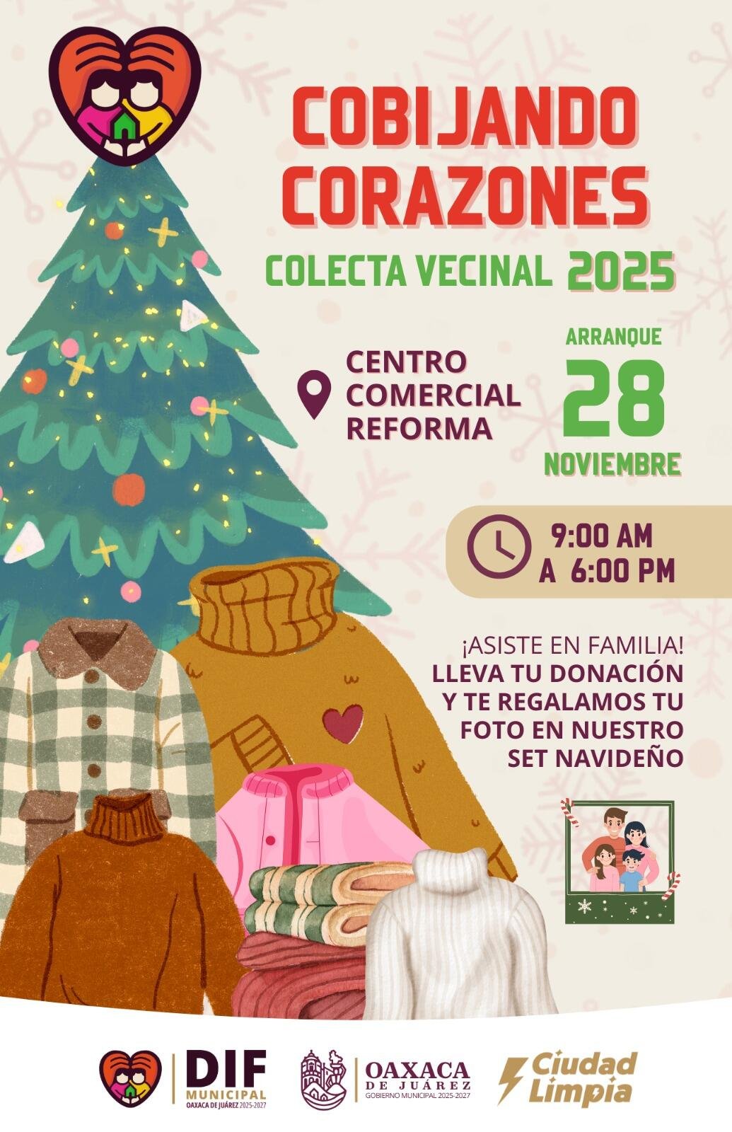 Oaxaca de Juárez, Oax., 26 de noviembre de 2025.- El Municipio de Oaxaca de Juárez, a través del DIF Municipal que preside la señora Gaby García, llevará a cabo la colecta vecinal “Cobijando Corazones 2025”, una iniciativa que busca reunir prendas de abrigo para apoyar a familias en situación de vulnerabilidad durante la temporada invernal.