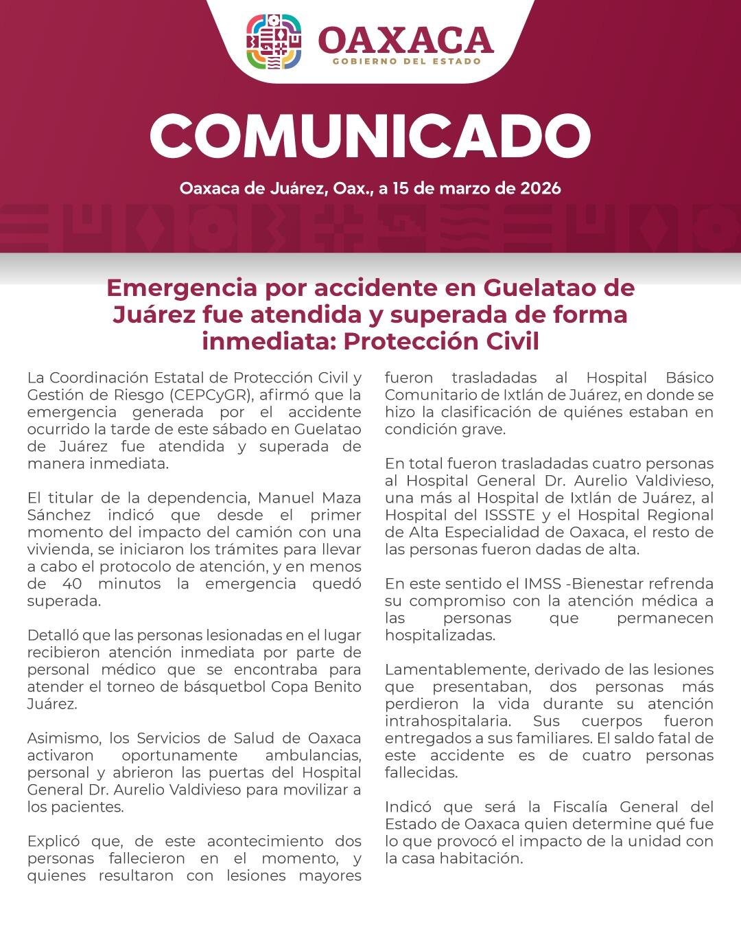 Oaxaca de Juárez, Oax. 15 de marzo de 2025.- La Coordinación Estatal de Protección Civil y Gestión de Riesgo (CEPCyGR), afirmó que la emergencia generada por el accidente ocurrido la tarde de este sábado en Guelatao de Juárez fue atendida y superada de manera inmediata.
