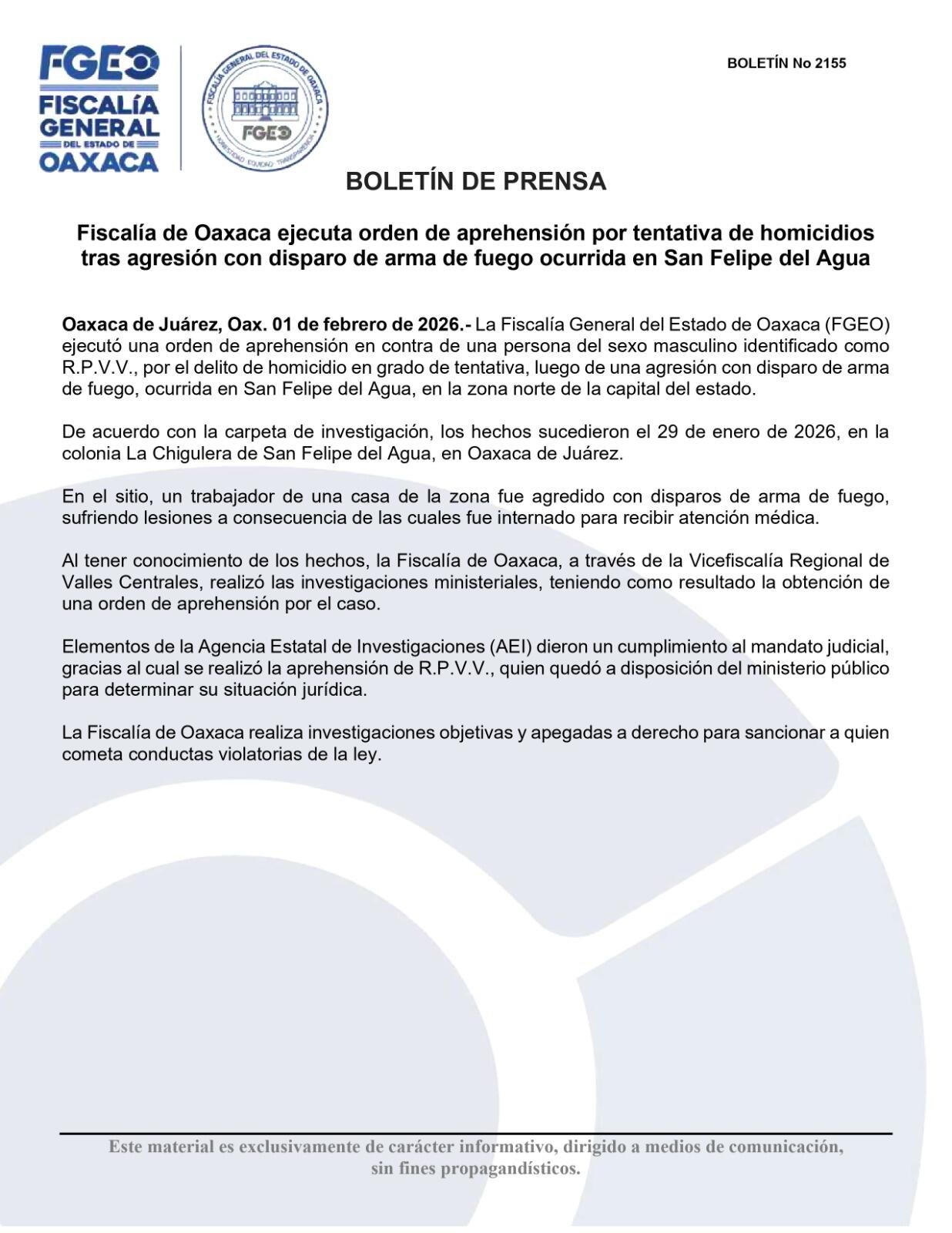 *Oaxaca de Juárez, Oax. 01 de febrero de 2026.-* La Fiscalía General del Estado de Oaxaca (FGEO) ejecutó una orden de aprehensión en contra de una persona del sexo masculino identificado como R.P.V.V., por el delito de homicidio en grado de tentativa, luego de una agresión con disparo de arma de fuego, ocurrida en San Felipe del Agua, en la zona norte de la capital del estado.