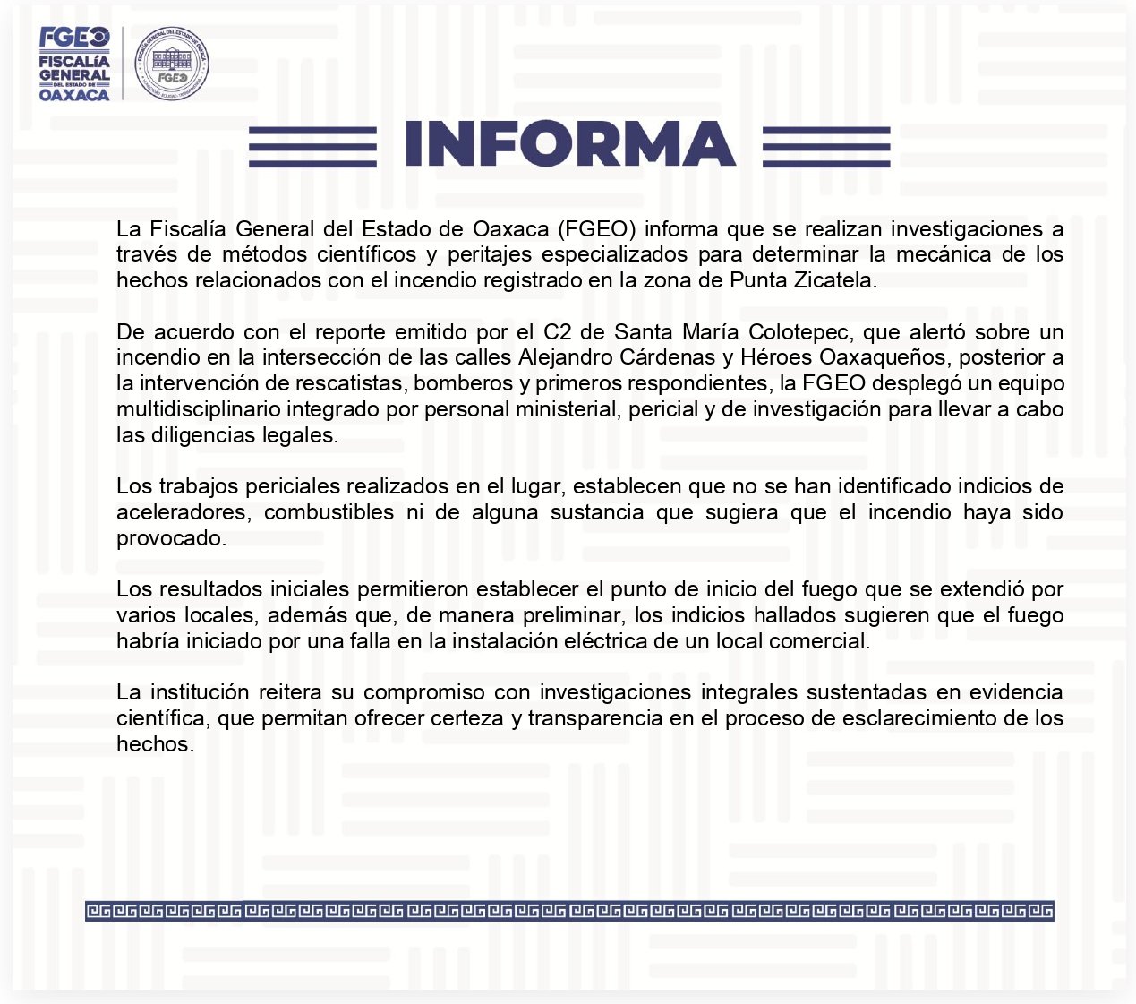 La Fiscalía General del Estado de Oaxaca (FGEO) informó que las investigaciones sobre el incendio ocurrido en la zona de Punta Zicatela avanzan con base en peritajes científicos y evidencia técnica.