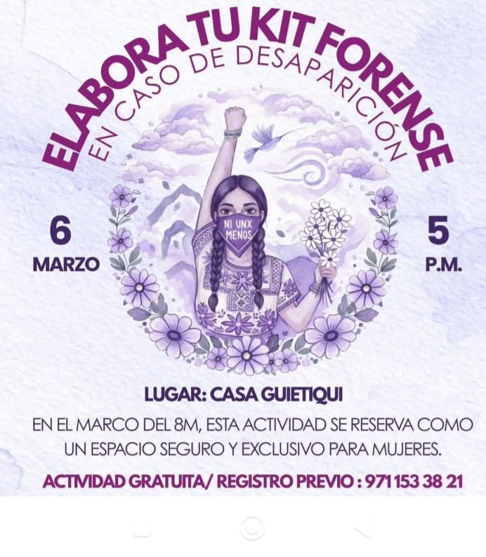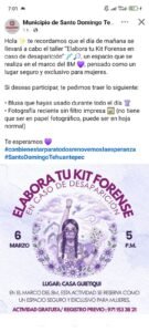 La invitación del gobierno municipal de Santo Domingo Tehuantepec a un taller para que mujeres elaboren un “kit forense en caso de desaparición” provocó una fuerte reacción en redes sociales. Colectivos feministas y ciudadanas señalaron que este tipo de actividades normalizan la violencia contra las mujeres y las colocan como responsables de enfrentar escenarios de desaparición forzada y muerte.