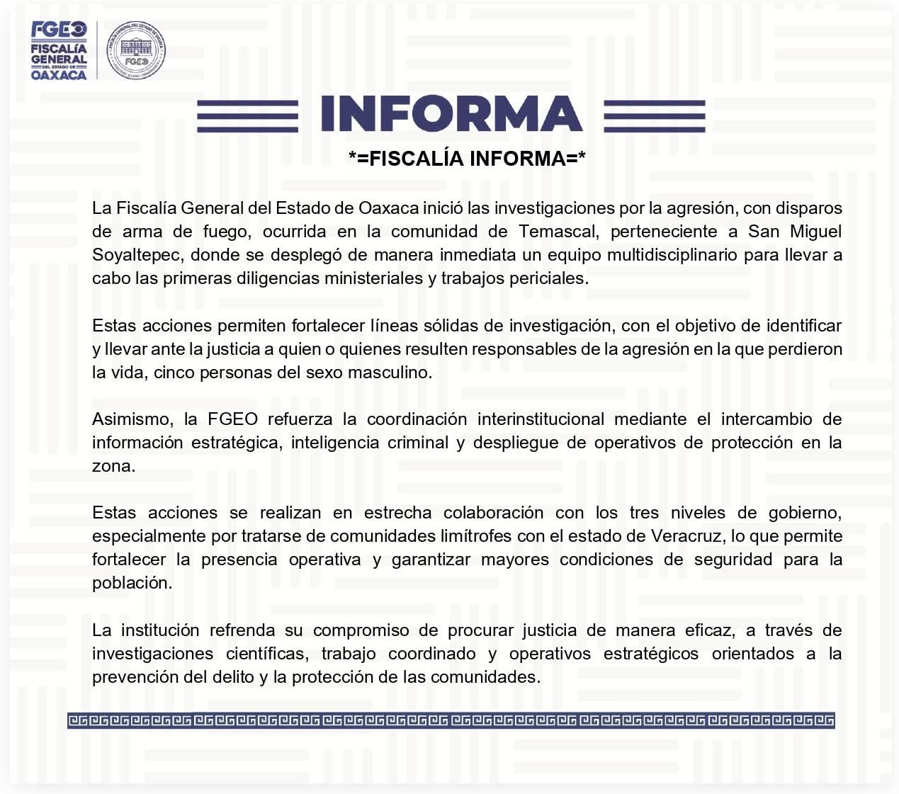 La Fiscalía General del Estado de Oaxaca inició las investigaciones por la agresión, con disparos de arma de fuego, ocurrida en la comunidad de Temascal, perteneciente a San Miguel Soyaltepec, donde se desplegó de manera inmediata un equipo multidisciplinario para llevar a cabo las primeras diligencias ministeriales y trabajos periciales.