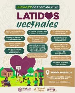 Oaxaca de Juárez, Oax. 22 de enero de 2026.- Con el objetivo de fortalecer la convivencia, promover la cultura de la paz y acercar actividades preventivas a niñas, niños, juventudes y familias, el Gobierno Municipal de Oaxaca de Juárez invita a la ciudadanía a participar en Latidos Vecinales, una estrategia que impulsa el bienestar comunitario y la participación social desde el territorio.