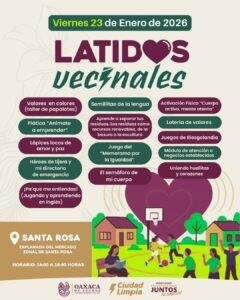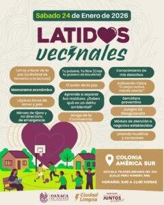 Oaxaca de Juárez, Oax. 22 de enero de 2026.- Con el objetivo de fortalecer la convivencia, promover la cultura de la paz y acercar actividades preventivas a niñas, niños, juventudes y familias, el Gobierno Municipal de Oaxaca de Juárez invita a la ciudadanía a participar en Latidos Vecinales, una estrategia que impulsa el bienestar comunitario y la participación social desde el territorio.