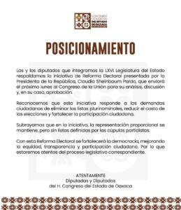 A su vez, la LXVI Legislatura del H. Congreso del Estado de Oaxaca., emitió un pronunciamiento que respalda también a la jefa del Ejecutivo.