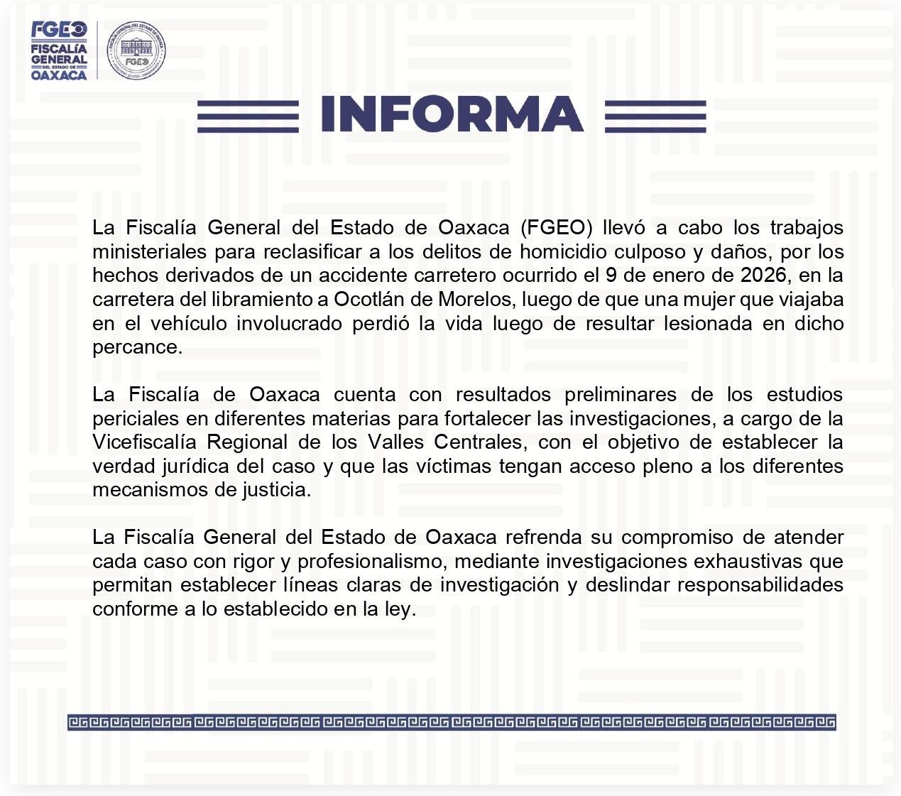 La Fiscalía General del Estado de Oaxaca informó sobre la reclasificación de los delitos derivados de un accidente ocurrido el pasado 9 de enero en el libramiento de Ocotlán de Morelos,.