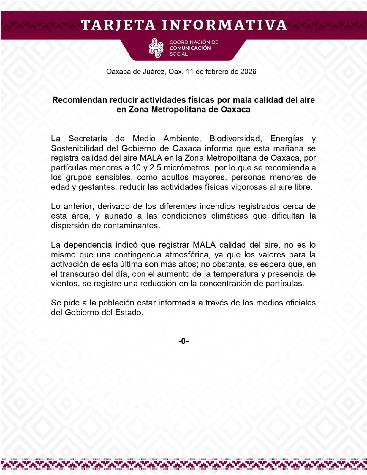 La Secretaría de Medio Ambiente, Biodiversidad, Energías y Sostenibilidad del Gobierno de Oaxaca informa que esta mañana se registra calidad del aire MALA en la Zona Metropolitana de Oaxaca, por partículas menores a 10 y 2.5 micrómetros, por lo que se recomienda a los grupos sensibles, como adultos mayores, personas menores de edad y gestantes, reducir las actividades físicas vigorosas al aire libre.