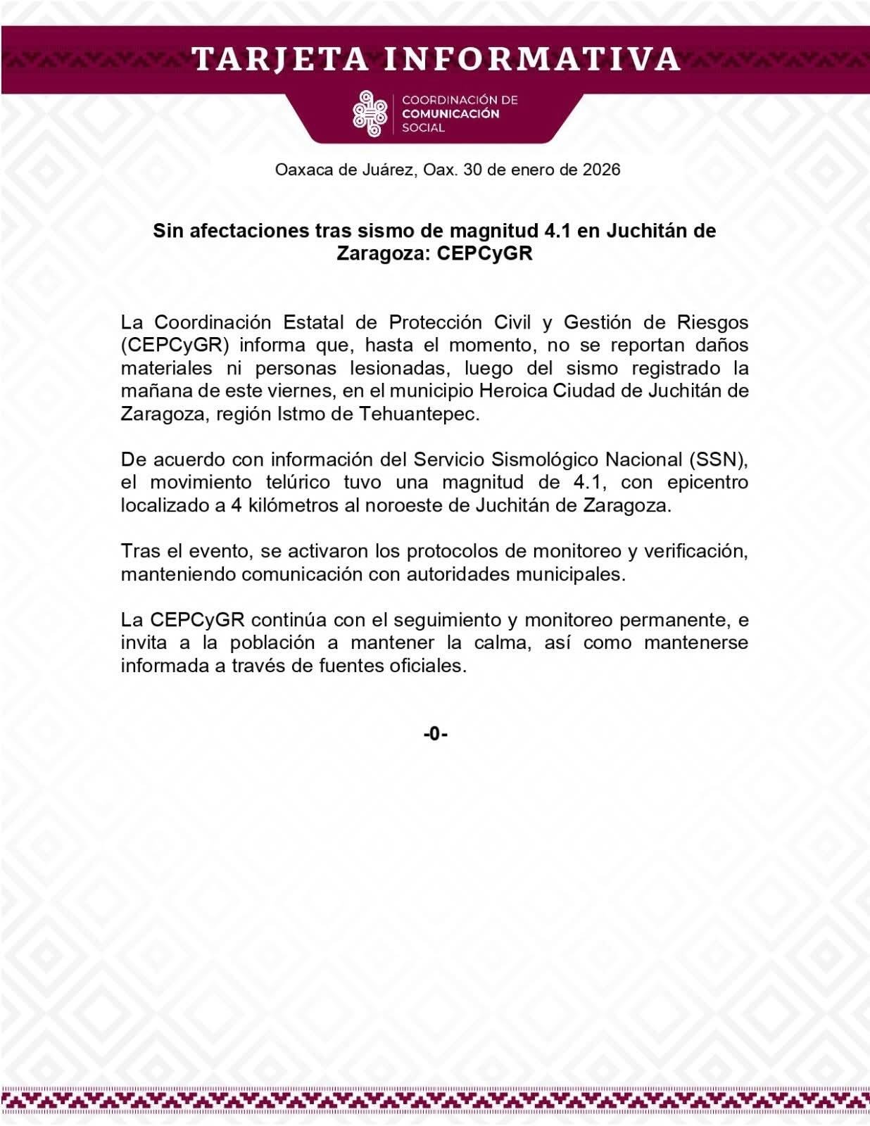 La Coordinación Estatal de Protección Civil y Gestión de Riesgos (CEPCyGR) informa que, hasta el momento, no se reportan daños materiales ni personas lesionadas, luego del sismo registrado la mañana de este viernes, en el municipio Heroica Ciudad de Juchitán de Zaragoza, región Istmo de Tehuantepec.